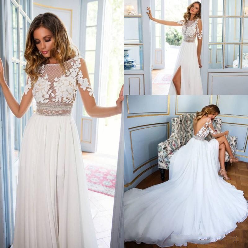 Bohemian wedding dresses with romantic lace sleeves, long sleeves and short cap sleeves.